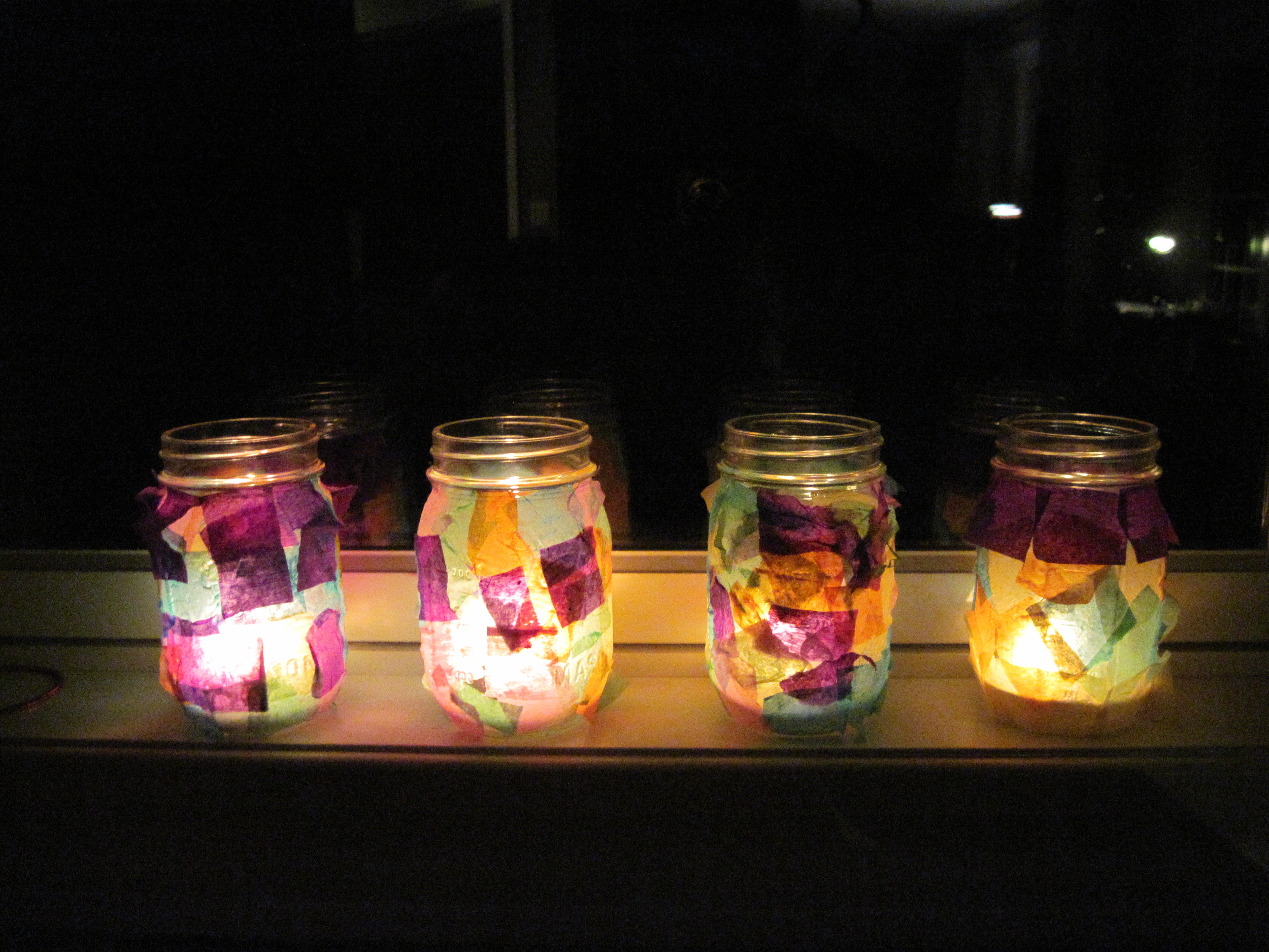 Starting with pint-sized mason jars, or any other small jars (jelly jars work well), cut various colors of crepe paper into small squares. Mix equal parts school glue and water in a small bowl, and use to “paint” the jar in sections so you can apply the paper. If you would like, you can also apply a layer of glue over the top of the paper once it’s dry, to make it more sturdy and waterproof.