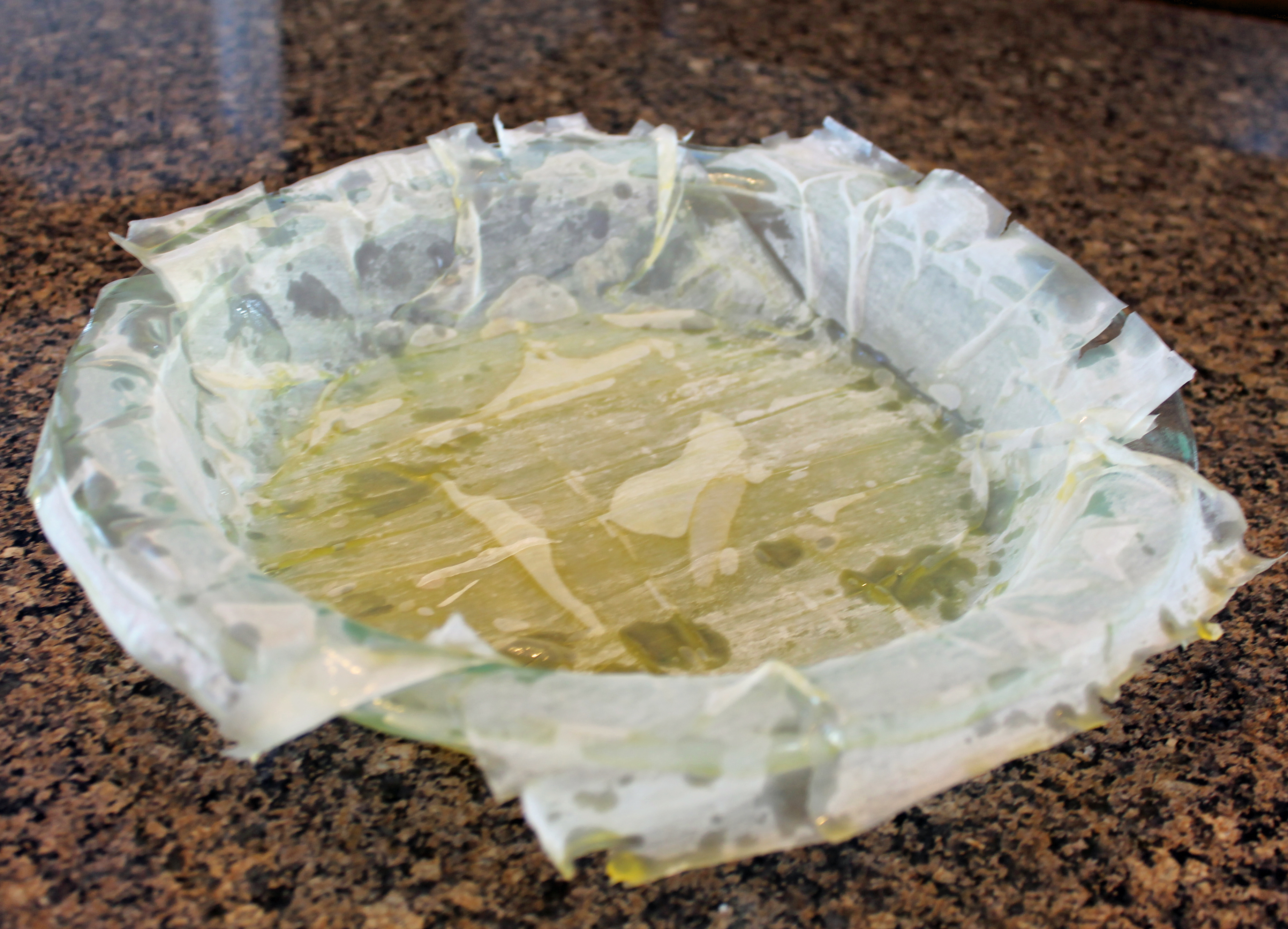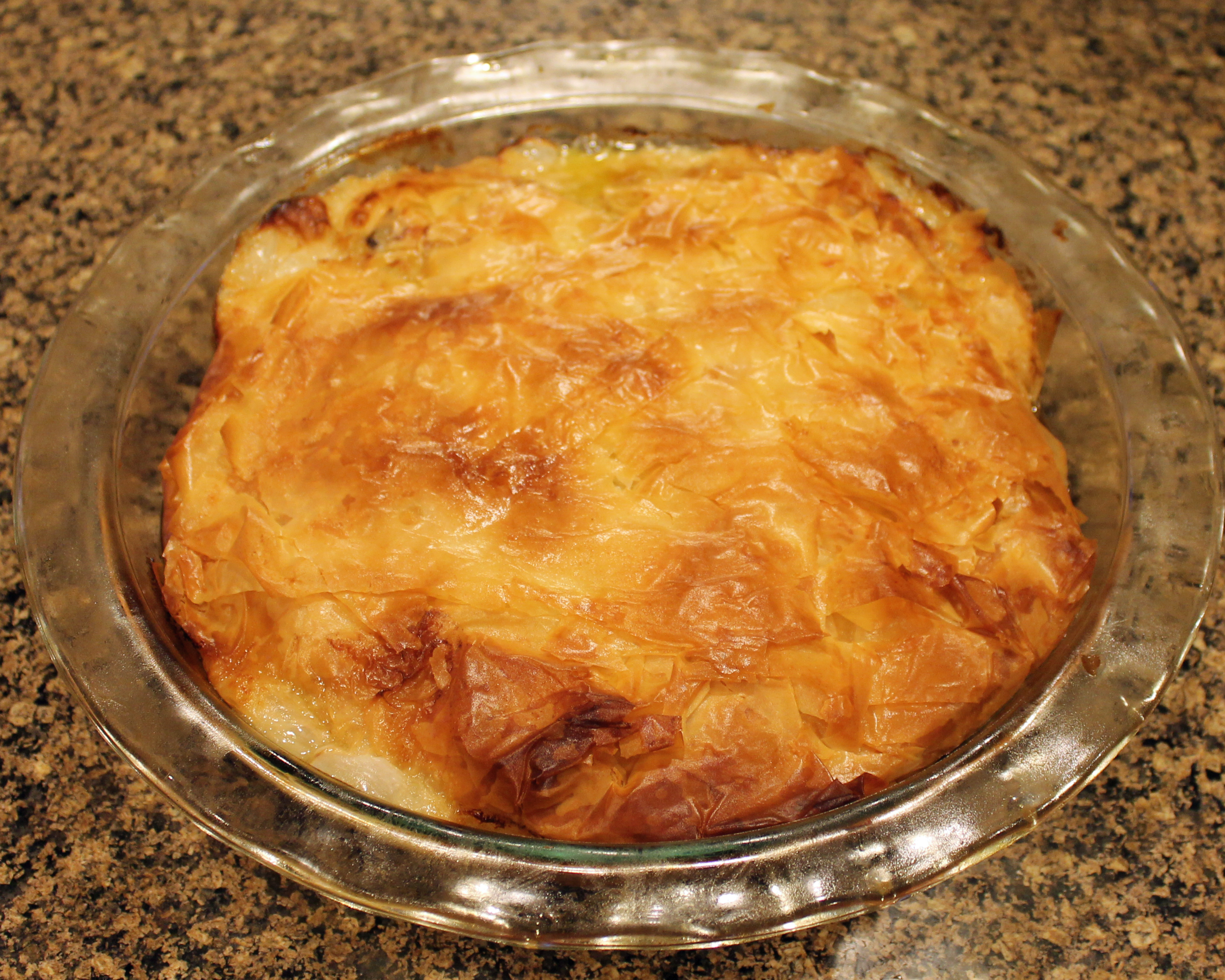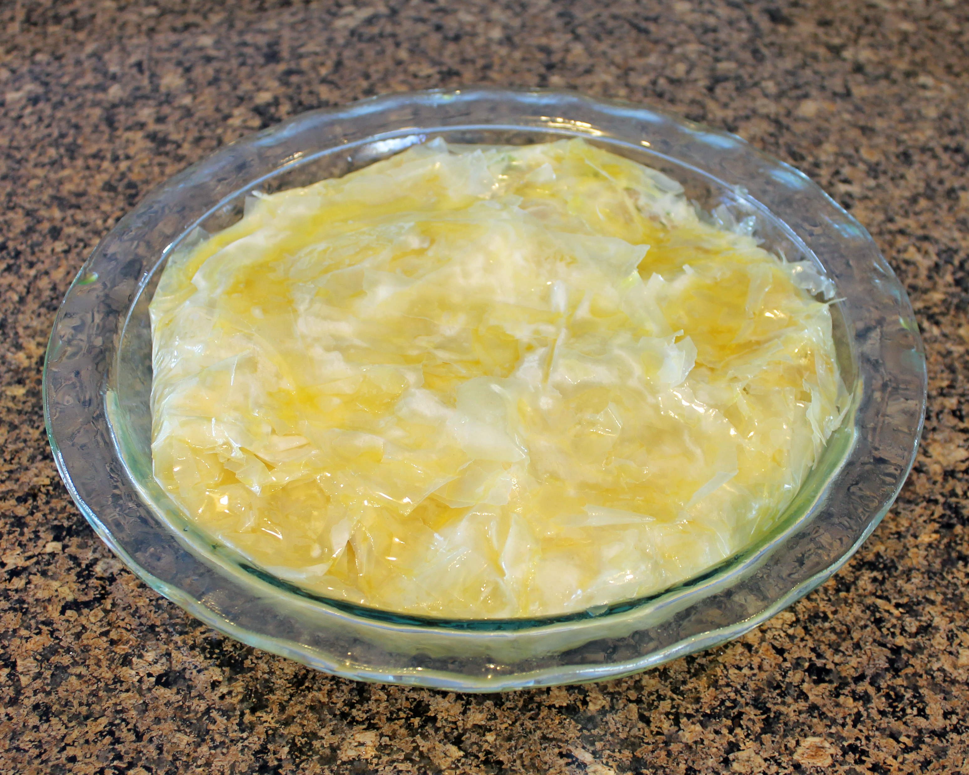 Carefully place the phyllo sheet on a 10 inch pie plate, letting edges drape off the side of the pie plate. Repeat with all remaining sheets, offsetting the dough each time. Allow enough dough to drape off the sides to allow fold-over to create a top crust once the filling is in.
