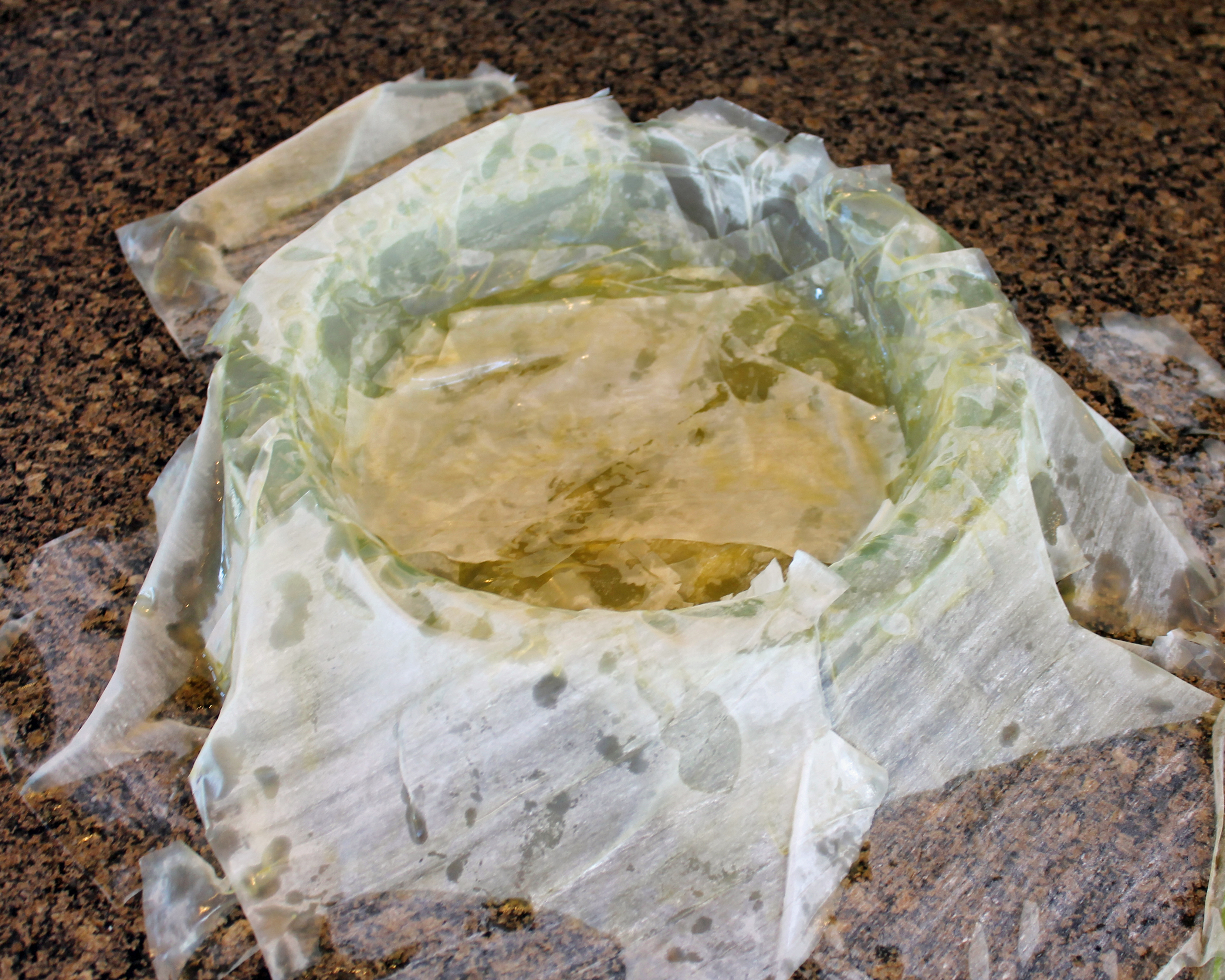 Now, for the phyllo crust. Phyllo crusts are made of many paper-thin sheets of dough, which together result in a flaky, tender crust. Phyllo needs to be completely thawed before you try to work with it, or it will crack.