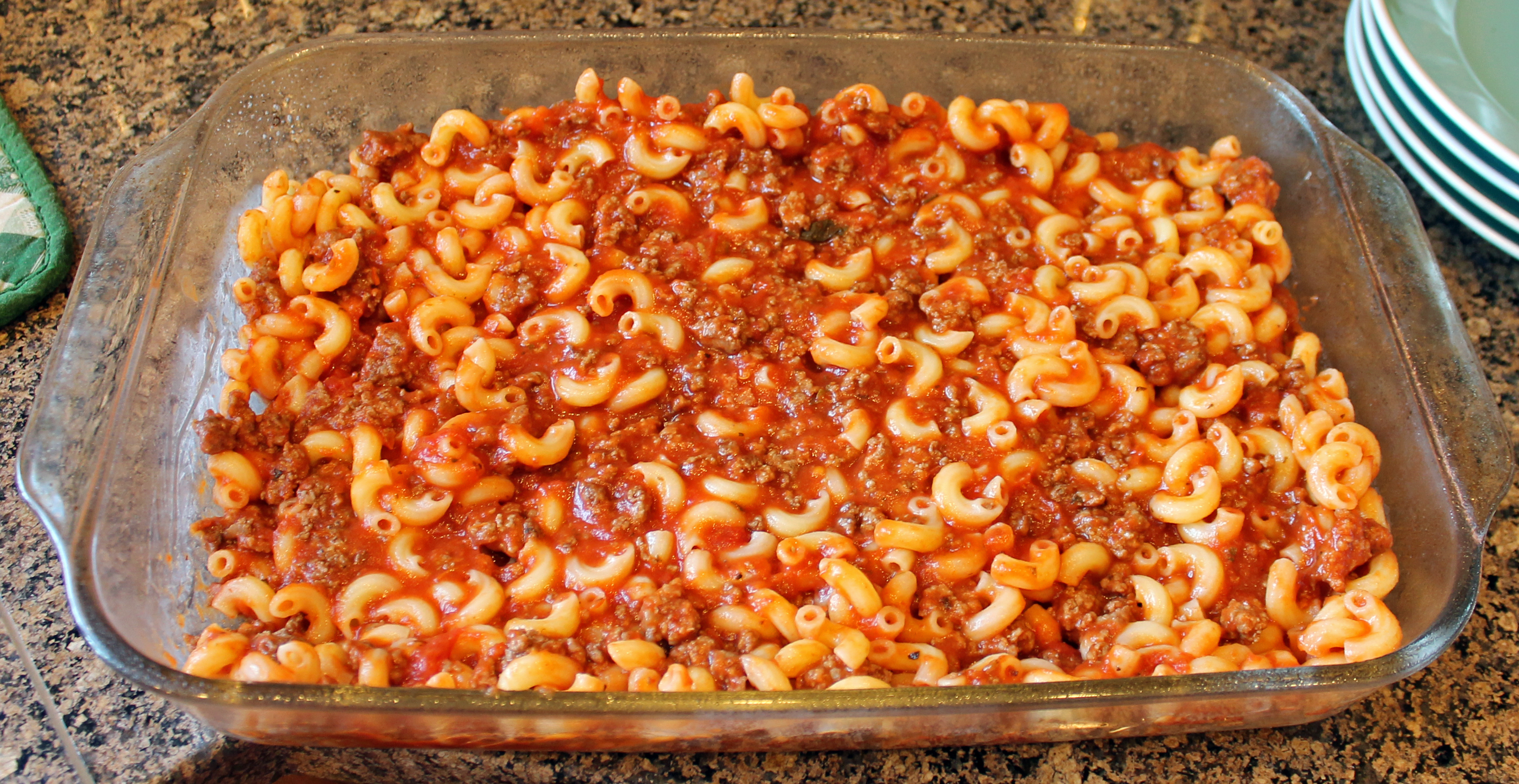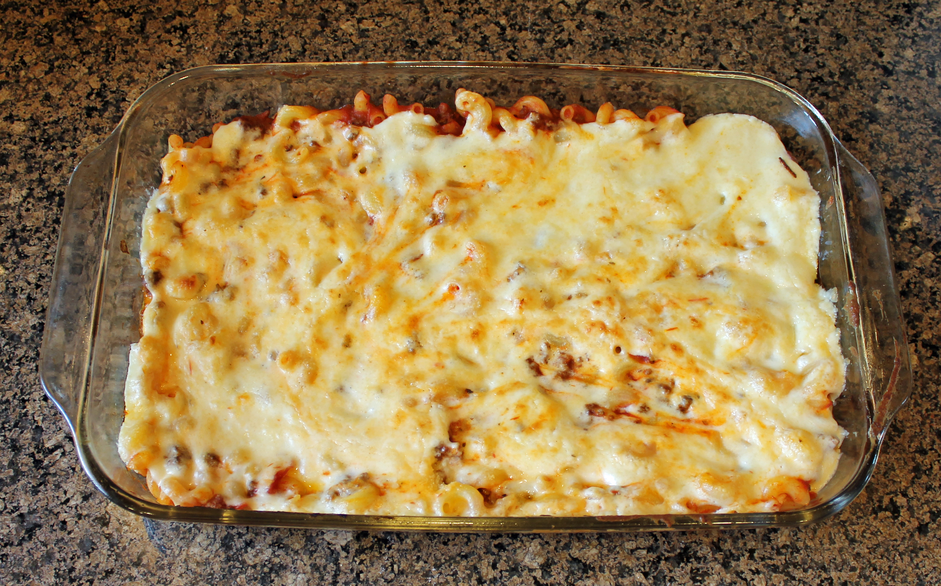 Spoon half of macaroni into lightly greased 11 by 7 inch pan. Top with marinara mixture, spread evenly.