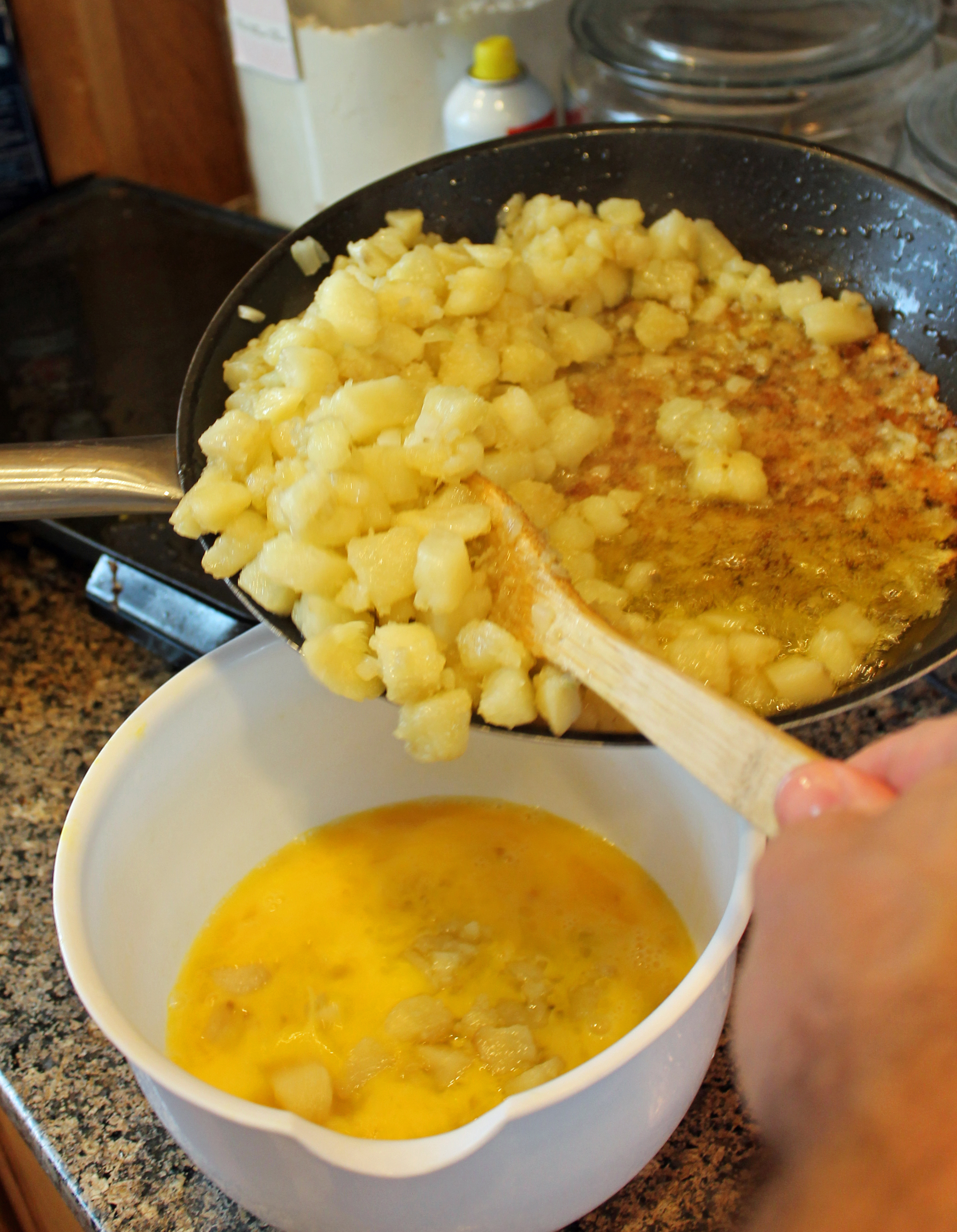 Spanish tortilla 001Once potatoes are cooked, remove from heat and drain (save the oil!)  In a large bowl, add potatoes, eggs, onion (if you’re using it) and salt and pepper.