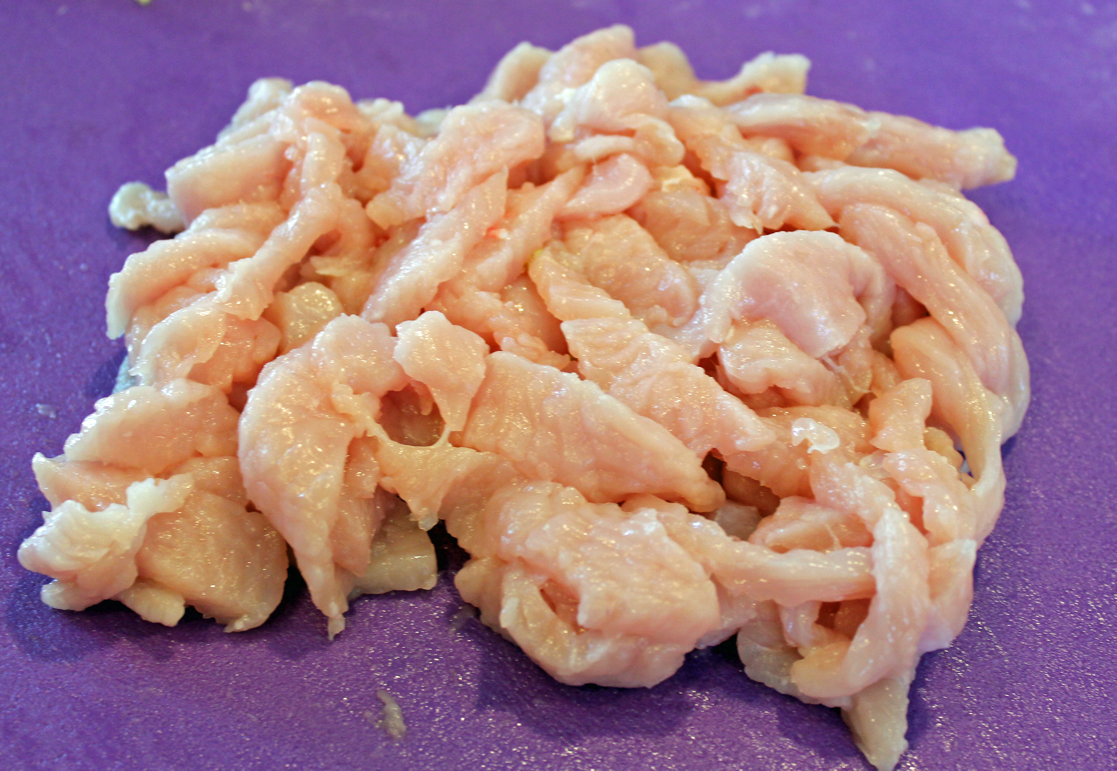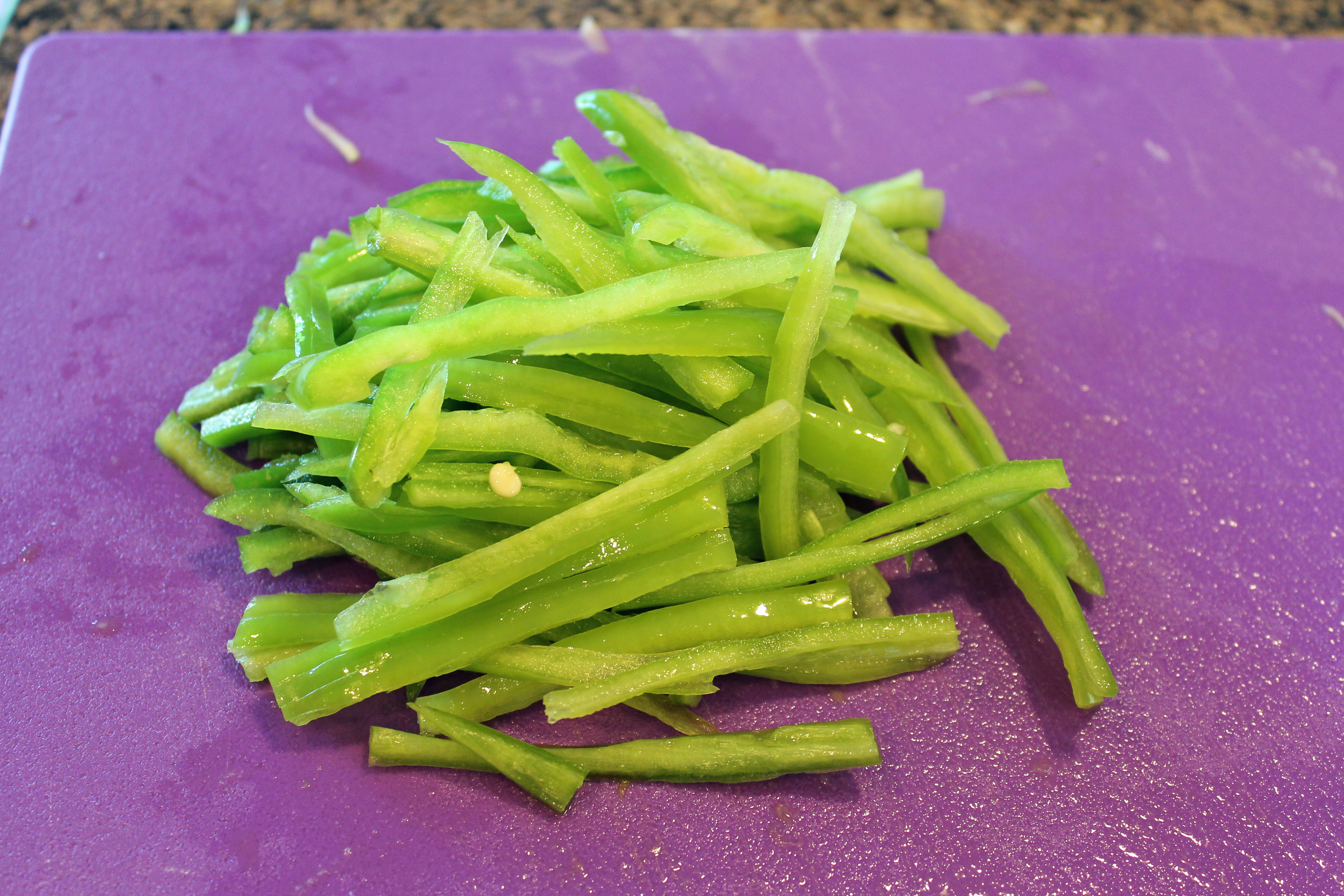 At the end of the two hours, thinly slice onions and peppers to match potatoes. Mince garlic and ginger. Then slice chicken into the thinnest slices you can.