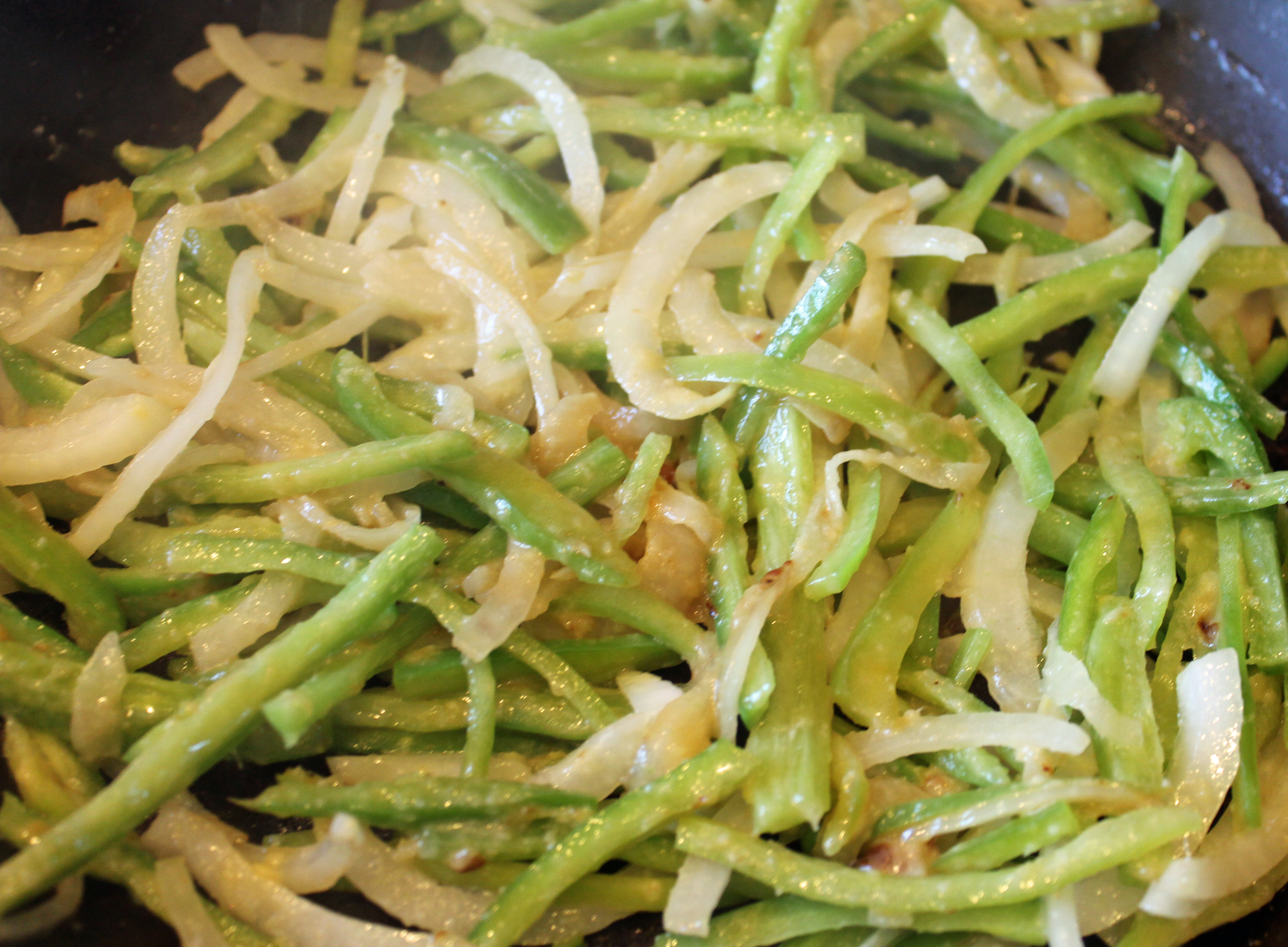 Add additional oil, and add half the ginger and garlic to the pan. Cook until “it smells good”, then add peppers and onions, stir fry for 1-2 minutes or till onions are translucent. Again, do not brown! Remove from pan.