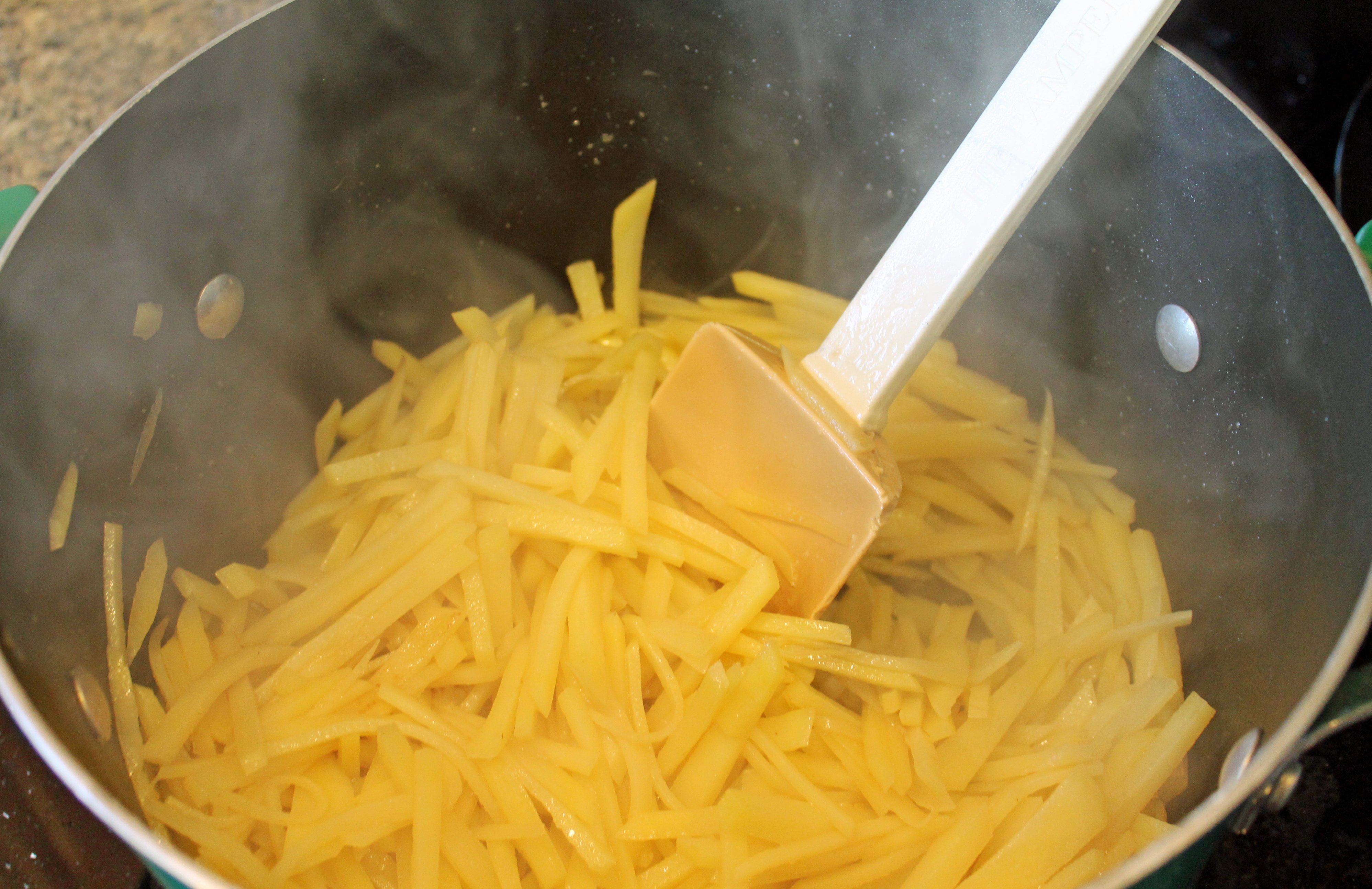 7th Grade Band Pops concert 003Peel potatoes. Julienne in a very thin slice, you are aiming for 1/8 inch juliennes or less. Do the best you can. Cover potatoes in cold water and soak for at least two hours. Every half hour, drain, rinse and refill the water in the bowl.