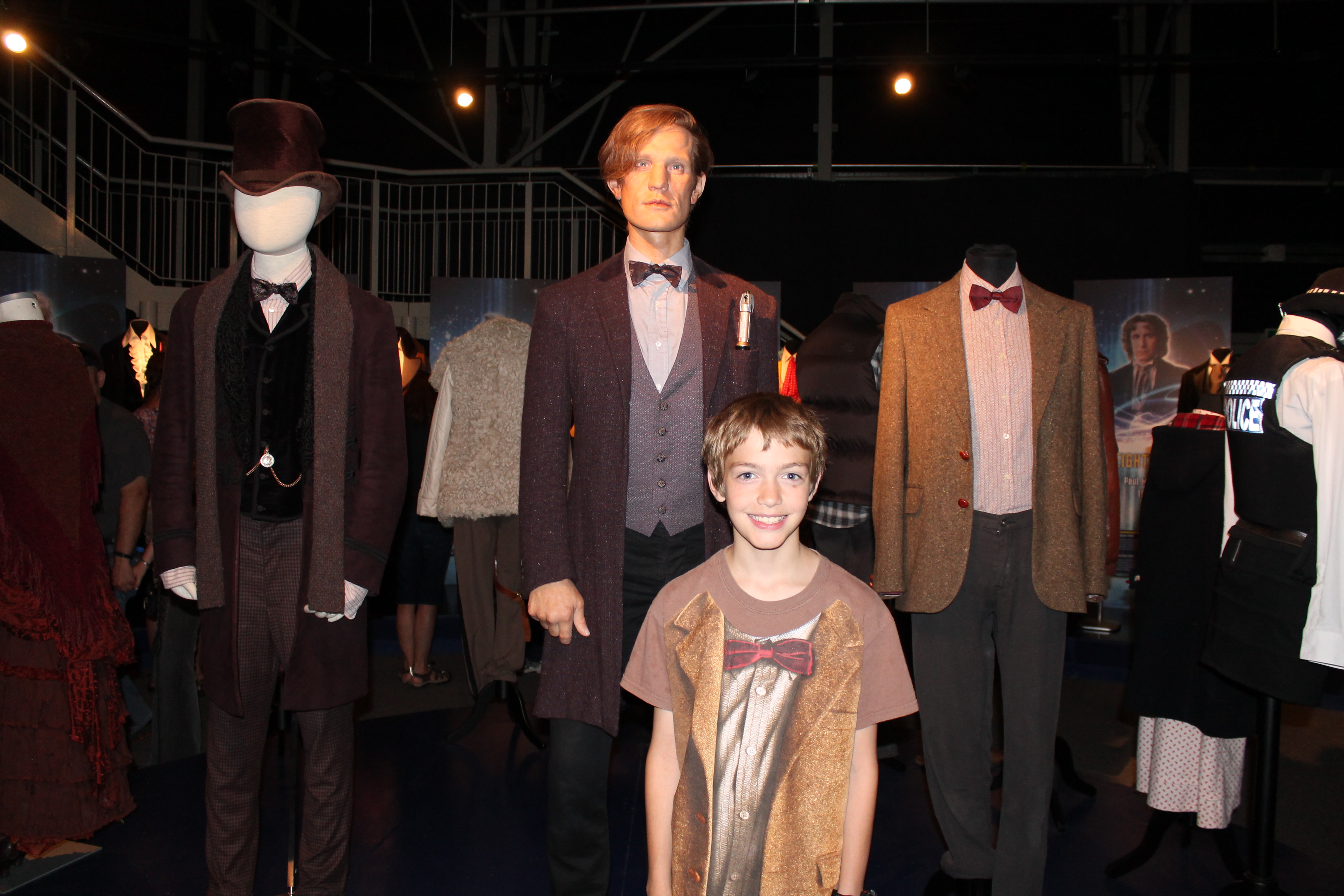 The author's son wearing a Doctor Who "costume" shirt standing in front of a wax statue of Matt Smith