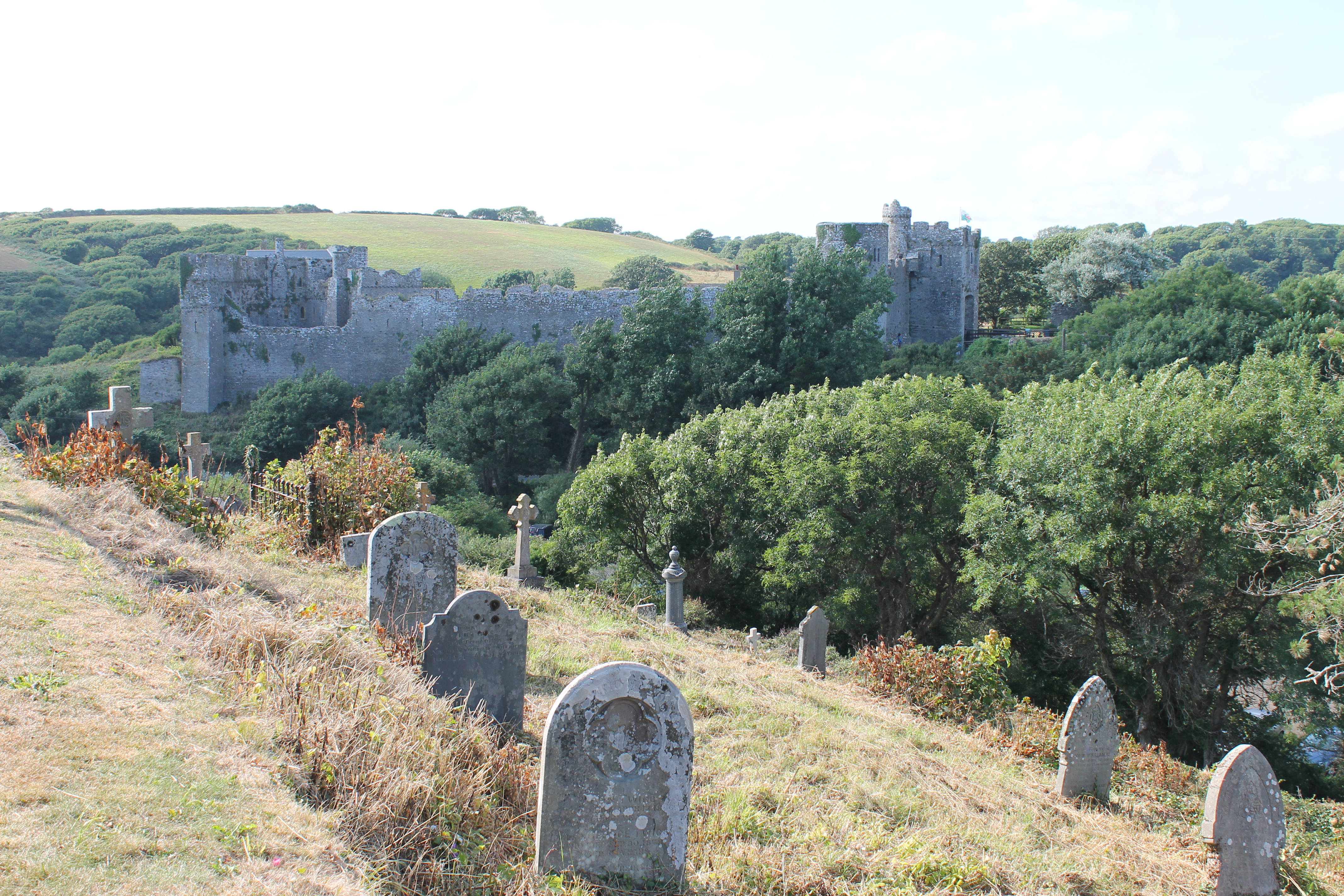 a beachAfter spending most of the day at the beach, we took the short walk up the hillside to a Norman church built above Manorbier Castle (also visible from the beach).  Though the church itself is fairly dull inside, the cemetery surrounding it is fascinating and evocative, especially as you sit overlooking the ancient castle walls.