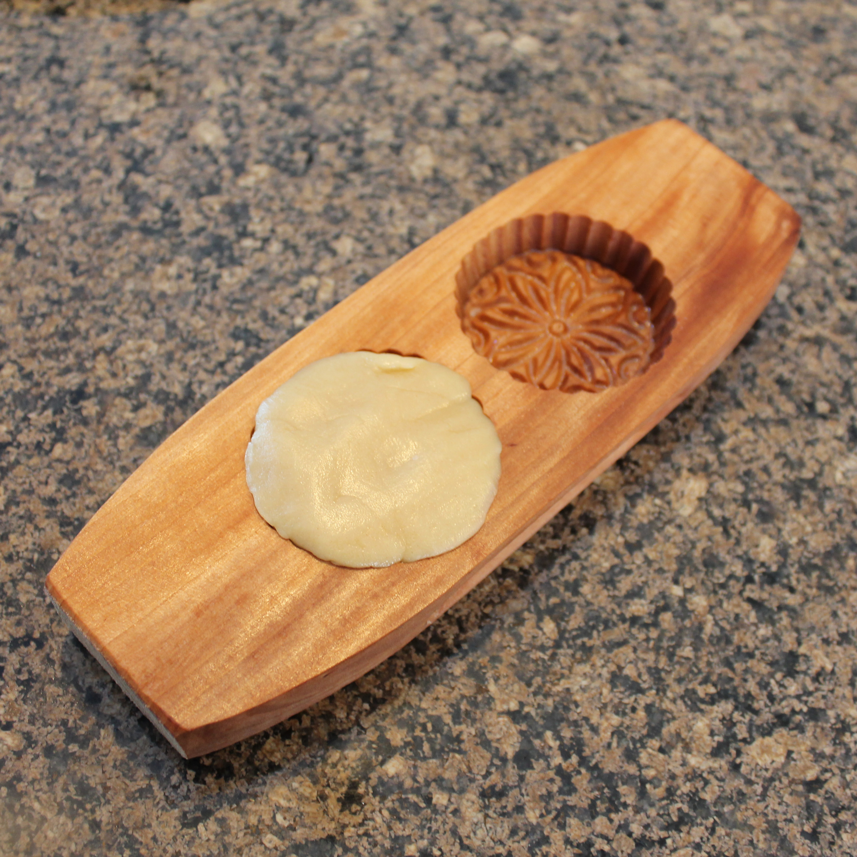 Place a small teaspoonful of filling in the middle and shape the dough into a ball around the filling, being careful not to tear the dough and let the filling escape. (You can patch and fill any torn spots with more dough, it won’t matter.) When you have a small ball, press it gently into your mooncake mold to create the pattern on top.