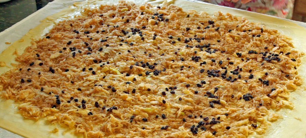 Strudel spreadWith a sharp knife, cut away the thick edge of dough and throw away. Carefully fold over the